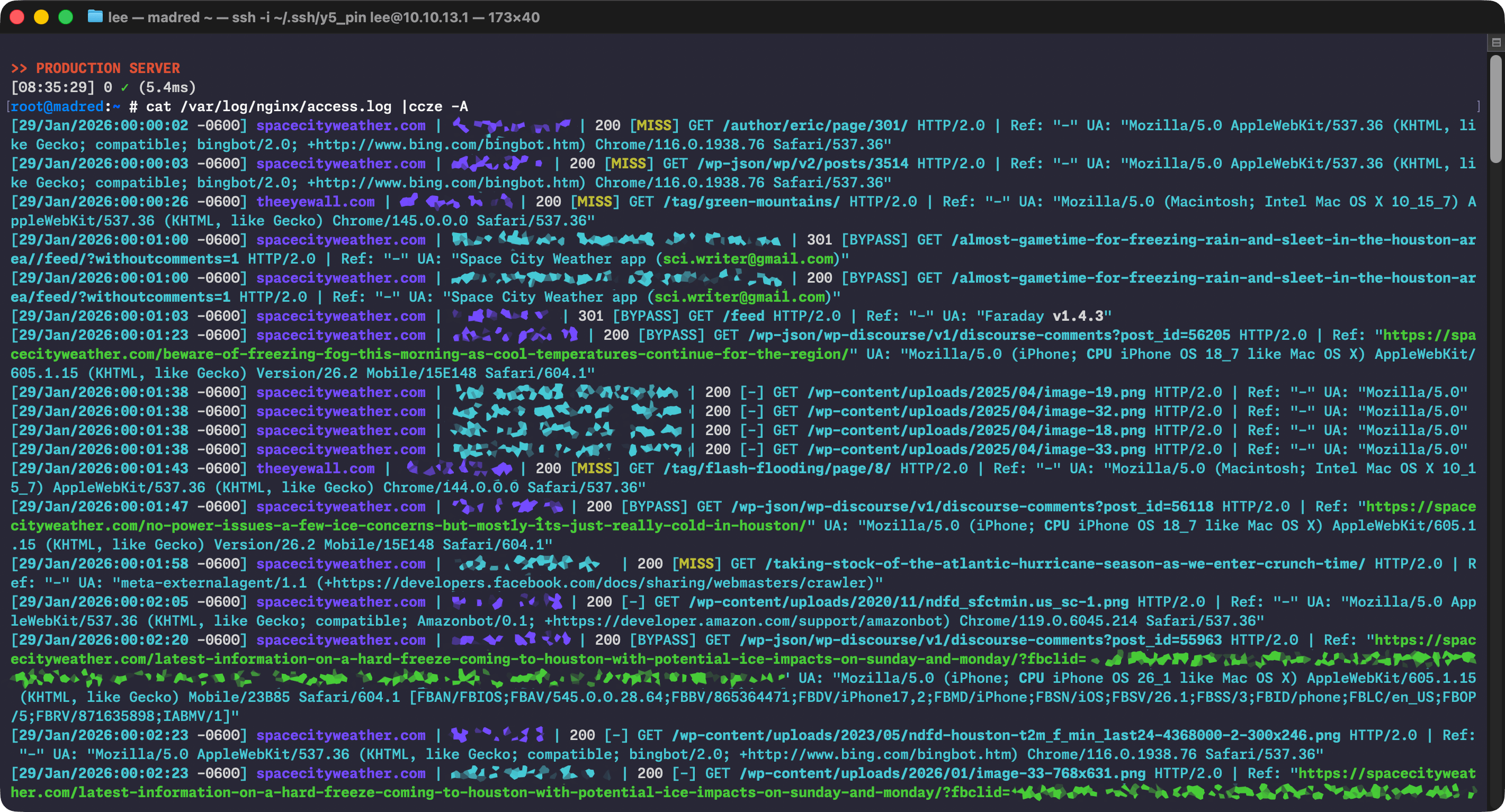 The Space City Weather web server uses Nginx for actual web serving. For folks who have never had the pleasure, Nginx, as configured in most of its distributable packages, keeps a pair of log files around—one that shows every request serviced and another just for errors.