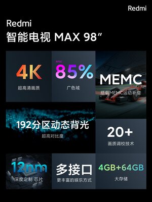 Главной гордостью Redmi Smart TV Max является 98-дюймовый экран с разрешением 4K (Ultra HD, 3840×2160 точек). Redmi отмечает, что он на 13,6% больше стандартной 1,2-метровой односпальной кровати. Панель предлагает 85% цветового пространства NTSC, поддерживает технологию улучшения качества изображения MEMC с возможностью регулировки и обладает сверхвысокой контрастностью благодаря 192 зонам динамической фоновой подсветки.