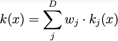 In the broader literature [2,3] kernels that adhere to this constraint are called g-steerable kernels. As the kernel constraint operates in a linear manner, the solutions it generates constitute a linear subspace within the vector space of unconstrained kernels typically utilized in standard CNN. Upon closer examination, this definition closely aligns with the concept of steerable filters introduced in paragraph 2 of the last article here. In practical terms, to get this work we need a basis for this kernel subspace, denoted as {k_1, …k_D} , which adheres to Eq.1 . The size of this basis, denoted as D, can be calculated as D = cʿⁿ ʾ ˟ cʿⁿ⁺¹ʾ. The kernel k(x) is subsequently derived through a linear combination of this basis, with the network learning the weights in the process: