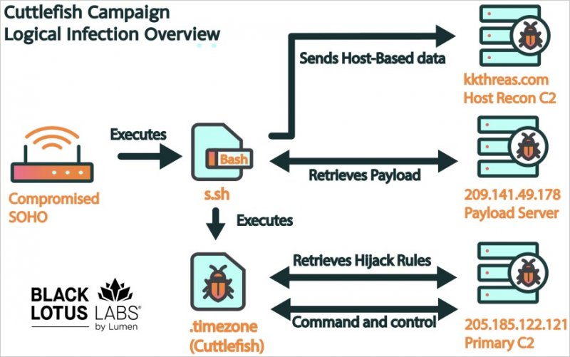 Эксперты Black Lotus Labs компании Lumen Technologies рассказывают, что Cuttlefish предназначен для кражи данных, содержащихся в веб-запросах, которые проходят через маршрутизатор из соседней локальной сети. Вредонос создает прокси- или VPN-туннель на взломанных устройствах и незаметно ворует данные, при этом обходя защитные меры, которые обычно обнаруживают необычную активность, связанную с входом в систему.