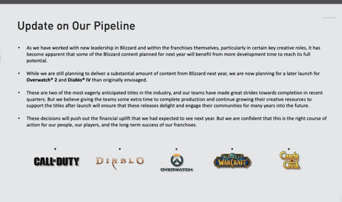 Сегодня компания Blizzard Entertainment во время ежеквартального отчёта инвесторам объявила о переносе выхода игр Diablo IV и Overwatch 2 на более поздний срок, чем изначально планировалось. Странно переносить то, что никогда не имело даже примерной даты выхода, но Blizzard это сделали. Изначально планировалось выпустить обе игры в неопределённом периоде "после 2021 года". Сегодняшнее заявление говорит о том, что игры точно не стоит ждать и в 2022 году. После пресс-релиза о переносе игр акции Activision Blizzard продемонстрировали существенное падение сразу на 10%. На фоне недавней отмены фестиваля BlizzCon, который был запланирован на февраль 2022 года, а также скандалах в компании данное заявление вызвало смятение в рядах инвесторов и акционеров.