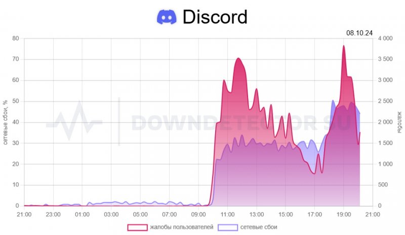 Утром 8 октября пользователи стали сообщать, что в работе Discord наблюдаются проблемы. Сообщалось, что мессенджер перестал запускаться на компьютерах и мобильных устройствах, не подключается к серверам, «бесконечно обновляется», а каналы и сообщения не отображаются. При этом отмечалось, что включение VPN устраняет проблему.