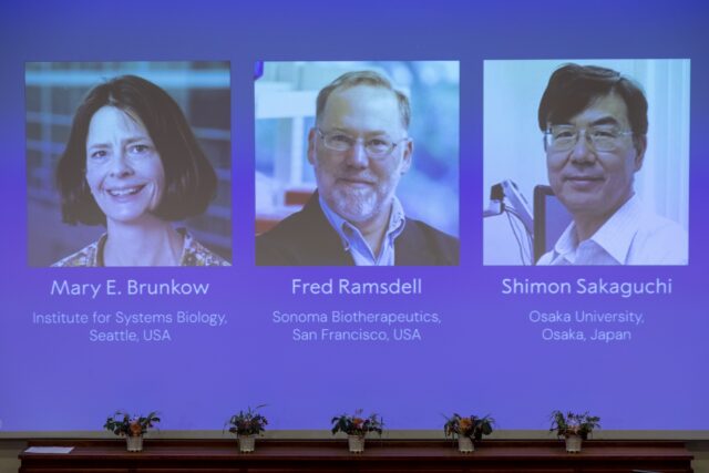 Announcement of the Nobel Prize in Physiology or Medicine 2025 awarded by the Nobel Assembly to scientists Mary E. Brunkow, Fred Ramsdell, and Shimon Sakaguchi at the Nobel Forum of Karolinska Institute, Stockholm City, Sweden, October 6, 2025. Credit: Getty | Narciso Contreras