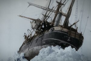The Endurance, frozen and keeled over in the ice of the Weddell Sea. Credit: BF/Frank Hurley