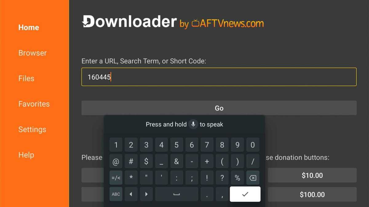 - Open the Downloader app, then enter 160445 in its address bar.
