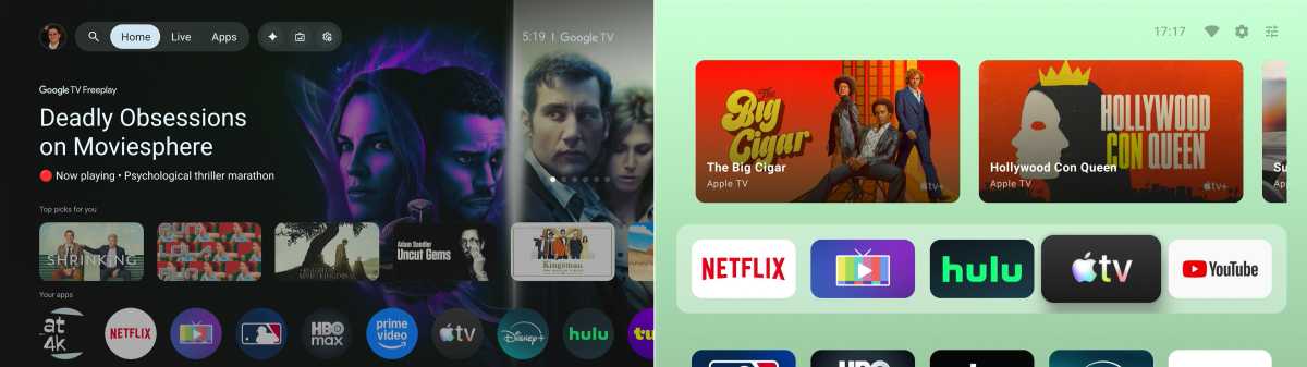 Google TV’s standard home screen (left) vs. AT4K Launcher (right)