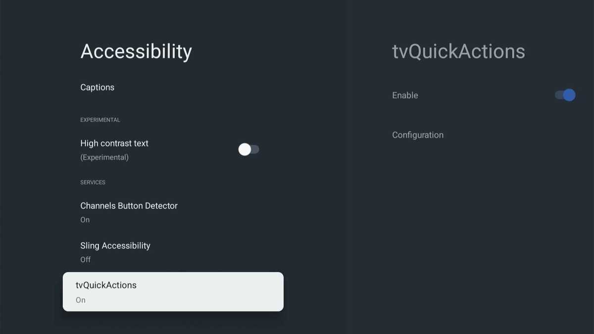 - In your device’s Settings menu, head to Accessibility, then scroll to the button and enable “tvQuickActions.”