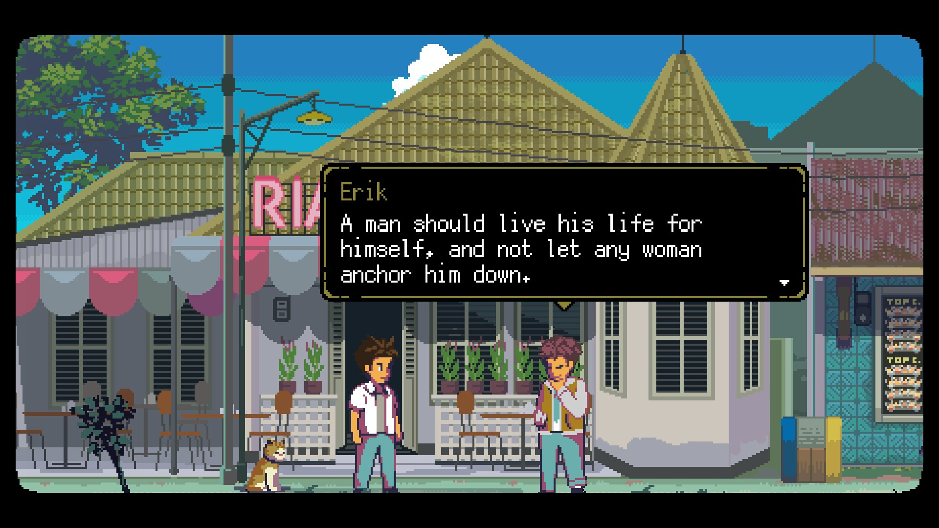 История в A Space for the Unbound многослойная и порой закручивается в странные петли, а потому, чтобы я не врал и меньше спойлерил, давайте считать так: завязка сюжета – попытки Атмы и его девушки осуществить свои мечты, которых набрался аж целый список. В желании совместно сходить в кино и завести животное нет ничего удивительного – подобные чувства понятны игрокам из любого поколения и региона, однако некоторые другие цели героев специфичны для конкретного сеттинга. Тот же Атма, например, жаждет побить рекорд в аркадном файтинге, однако не может себе позволить достаточное для тренировок число жетонов. Кроме того, парень мечтает собрать двадцать редких крышечек от газировки – задача по нынешним меркам странная, однако типичная для 90-х, когда в России провинциальные дети коллекционировали в том числе пачки от сигарет. Что до любимой девушки Атмы, то она хочет попробовать знаменитый немецкий шоколадный торт – дорогие десерты по западным рецептам тогда считались в Индонезии символом роскошной жизни.