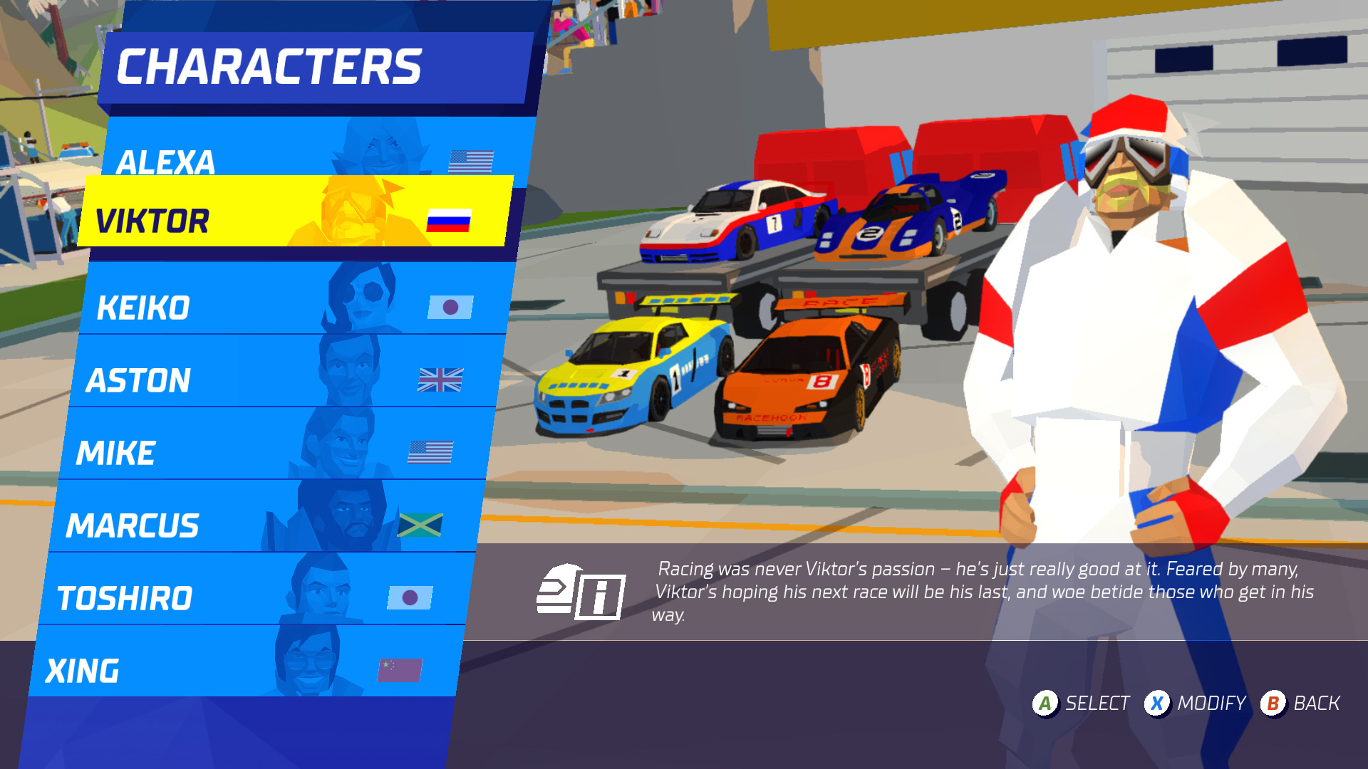 Любой заезд начинается с выбора гонщика. Здесь имеется 8 гонщиков, представляющих шесть разных стран, включая Россию. За каждым закреплено 4 машины, по одной от своего класса – сбалансированного, с упором на скорость, ускорение или дрифт. Внешне они заметно отличаются, а в большинстве автомобилей угадываются черты реальных моделей. Несмотря на разнящиеся характеристики, ощущаются на трассе все практически одинаково... и топорно. Физика езды излишне упрощенная и откровенно скучная. Машинки не только выглядят картонными, но и управляются будто картонные повозки. Реагируют на команды чересчур резко, и к этому долго предстоит привыкать. Дрифт интегрирован в процесс тоже на редкость бесцеремонно. Нажали кнопку и отклонили стик – пошел занос. Заморачиваться с траекторией и углами не надо, реализация предельно казуальная. Нет никаких до и после, как и промежуточных состояний стабилизации управления.