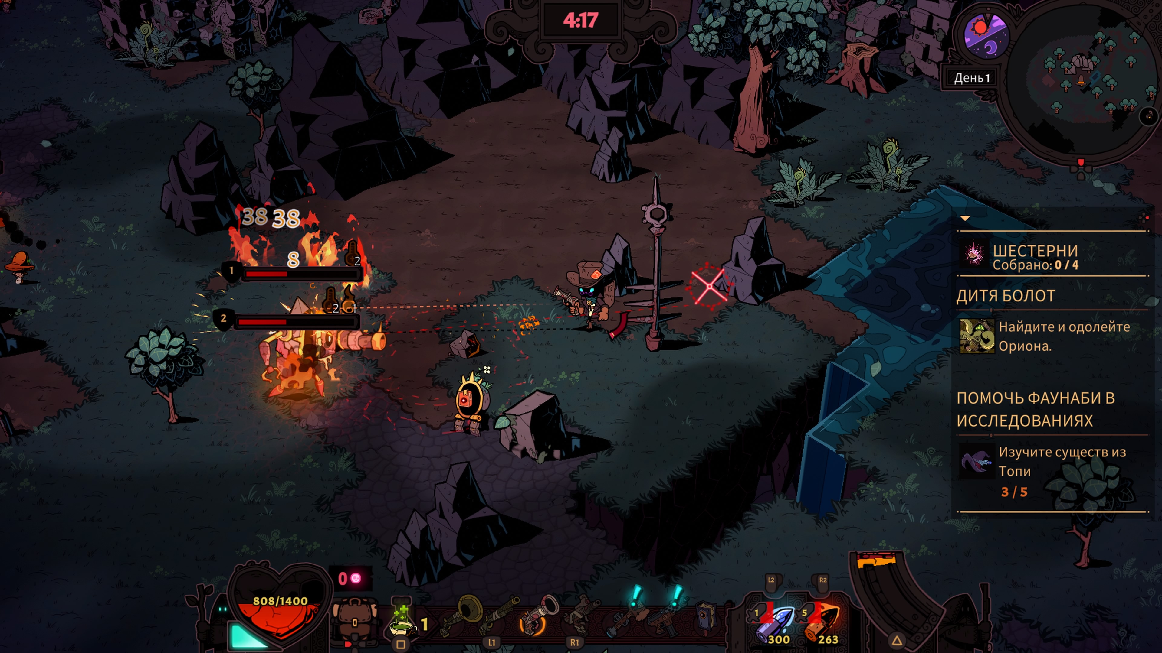 Боевая система проста и интуитивно понятна, представляет собой изометрический экшен с видом сверху. Левым стиком геймпада перемещаем персонажа, правым целимся, левым триггером стреляем первой пулей оружия, правым триггером – второй. Всего в игре предусмотрено пять уникальных боссов на пяти различных локациях. Каждая новая карта предлагает свежий опыт и особенности. Так, к примеру, вода в топях болот отравленная. Перемещаясь по таким ячейкам, вы получаете еще и отравление, но… и ваши враги тоже. Это становится не только препятствием для игрока, но и новой вспомогательной возможностью в борьбе с противниками.