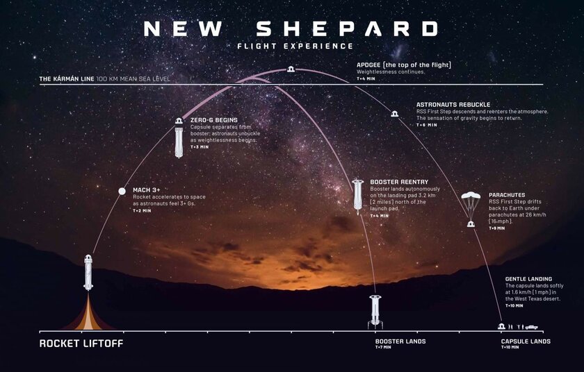 Остальные три места, если верить инсайдерам, будут предоставлены трём значимым сотрудниками Blue Origin или Amazon, но их личности до сих пор остаются под секретом. Впрочем, полётом в космос данный запуск можно назвать лишь с натяжкой — корабль пересечёт линию Кармана (100 километров над уровнем моря), которая является условной границей между атмосферой Земли и космосом, а продолжительность всего полёта, от момента запуска до раскрытия парашютов, составит всего 10 минут. То есть, технически это действительно полёт в космос, но это и близко не сравнится с путешествиями настоящих астронавтов.