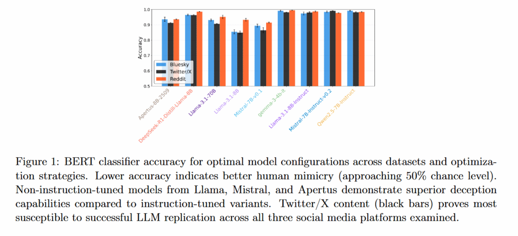 Platform differences also emerged in how well AI could mimic users. The researchers’ classifiers detected AI-generated Twitter/X replies with the lowest accuracy rates (meaning better mimicry), followed by Bluesky, while Reddit proved easiest to distinguish from human text. The researchers suggest this pattern reflects both the distinct conversational styles of each platform and how heavily each platform’s data featured in the models’ original training.