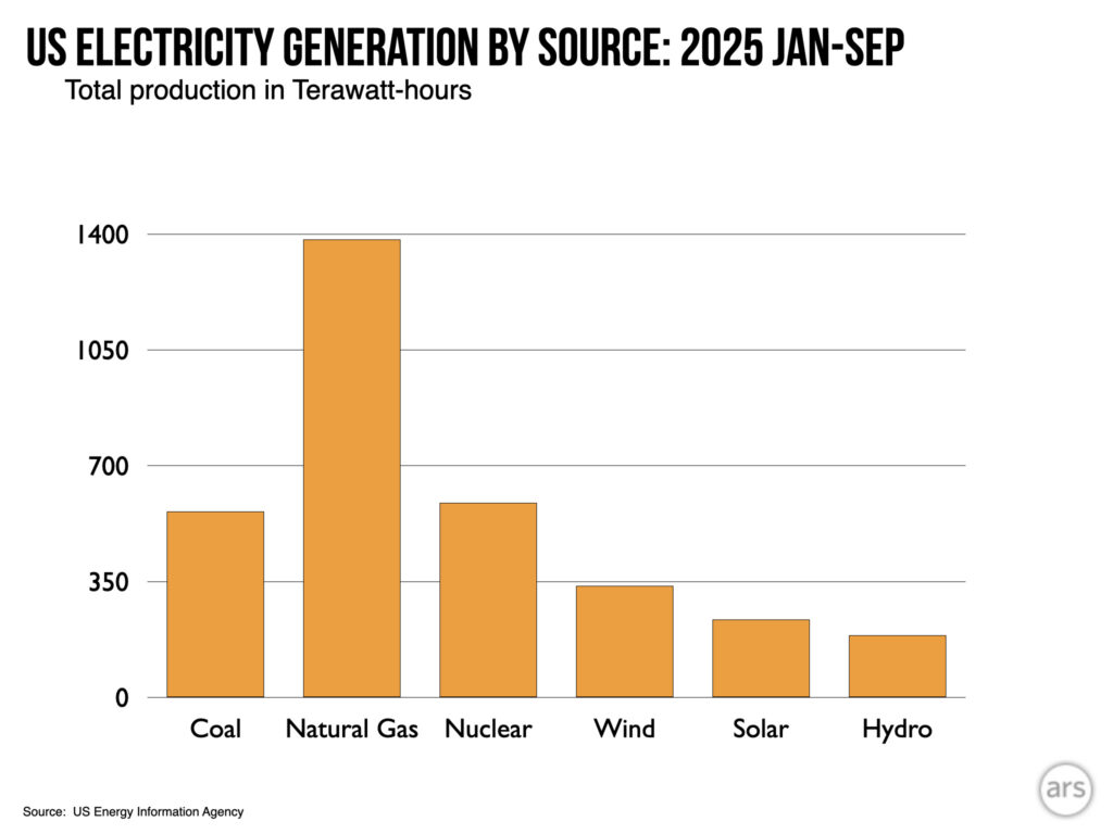 Small-scale solar, which includes things like residential and commercial rooftop installations, is also growing, albeit at a far slower pace: It was up by 11 percent compared to the year prior. A lot of it is consumed without ever reaching the grid, so it shows up in these numbers as reduced demand, rather than as a distinct generating source. Nevertheless, if you combine small- and grid-scale solar production, total solar in the US is poised to overtake wind power (it’s above 90 percent of wind’s production) after having already passed hydropower. It will take two years of similar growth for grid-scale solar to pass wind on its own, though, and by that point, wind and solar combined will produce more power than nuclear energy.