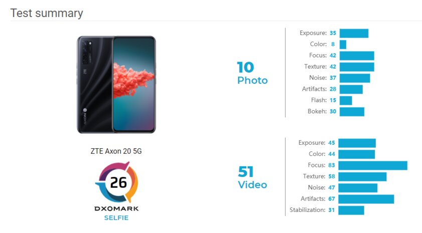 В конце прошлого года компания ZTE представила первый в мире смартфон с фронтальной камерой, которая находится прямо под дисплеем устройства — Axon 20 5G. Новинка казалась довольно интересной, но многих пользователей интересовало качество съёмки. Вскоре после релиза появились первые обзоры смартфона, в которых журналисты заявили, что снимает «фронталка» плохо, а сегодня, 19 февраля, компания DxOMark опубликовала свой полноценный тест гаджета, в котором передняя камера получила ужасно низкую оценку — всего 26 баллов. Стоит отметить, что это вторая с конца оценка в рейтинге известнейшей платформы — новейший гаджет ZTE превзошёл лишь бюджетный гаджет от Intex для индийского рынка.