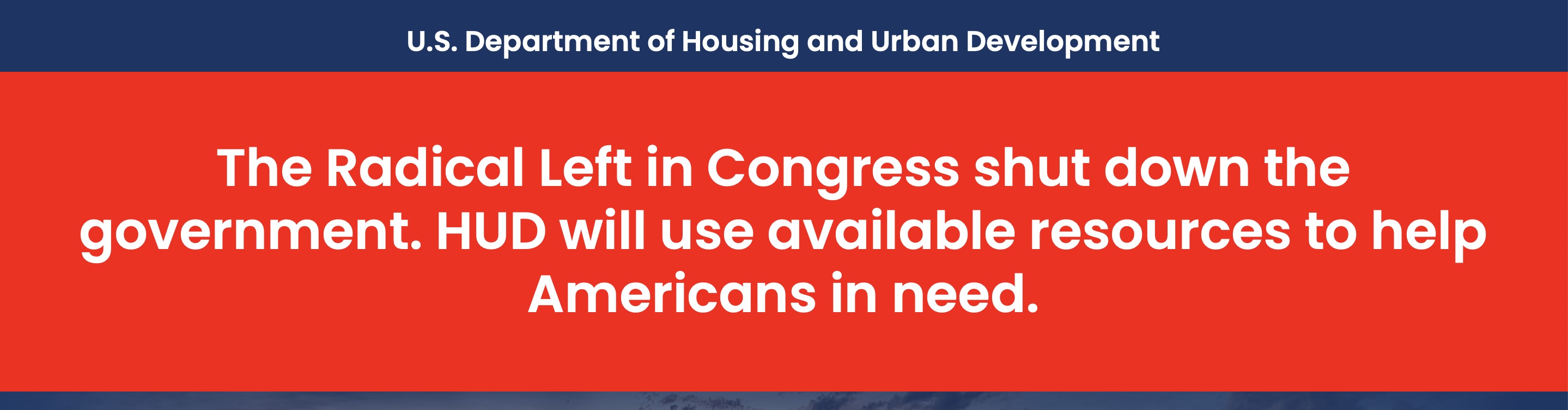 Department websites have also gotten in on the partisan action. The Department of Housing and Urban Development's site now loads with a large floating box atop the page, which reads, "The Radical Left in Congress shut down the government." When you close the box, you see atop the main page itself an eye-searingly red banner that says... the same thing. Thanks, I think we got it!