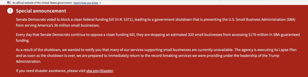 Over at the Small Business Administration, a banner atop the main page really makes sure to drive the partisanship home by blaming Democrats twice and praising Trump once: