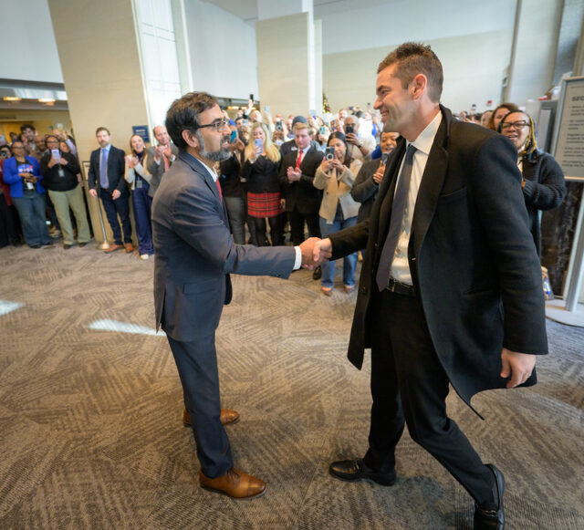 NASA Associate Administrator Amit Kshatriya, left, along with NASA employees, welcomes NASA Administrator Jared Isaacman to the Mary W. Jackson NASA Headquarters Building in Washington on Thursday, Dec. 18, 2025. Credit: NASA/Bill Ingalls